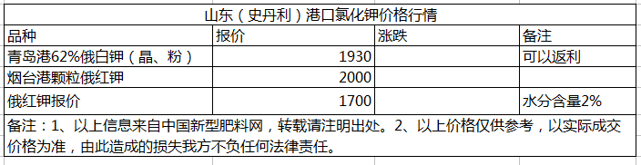 9月1日山東史丹利港口氯化鉀價格行情