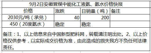 9月2日安徽晉煤中能化工液氨、氨水價格行情