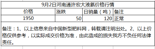 9月2日河南通許液氨價格行情