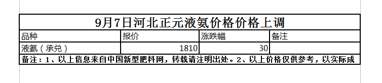 9月7日河北正元液氨價格價格上調(diào)