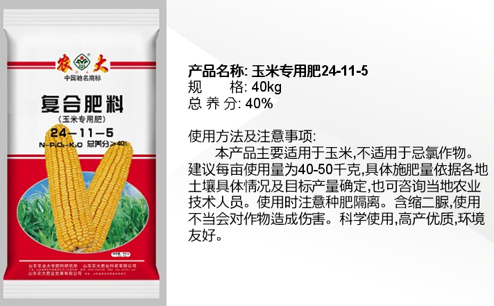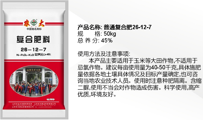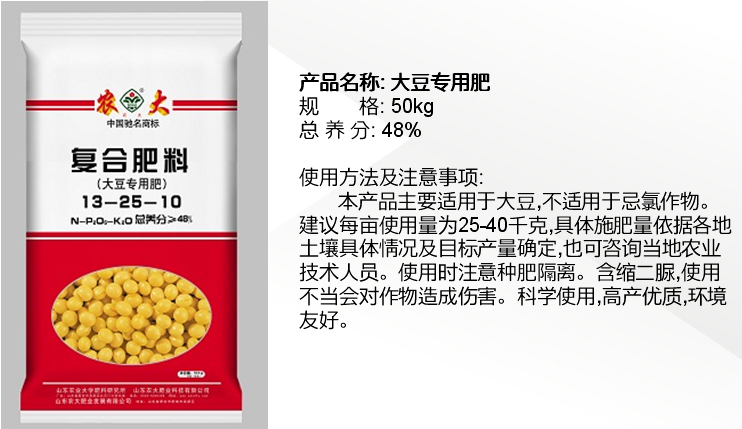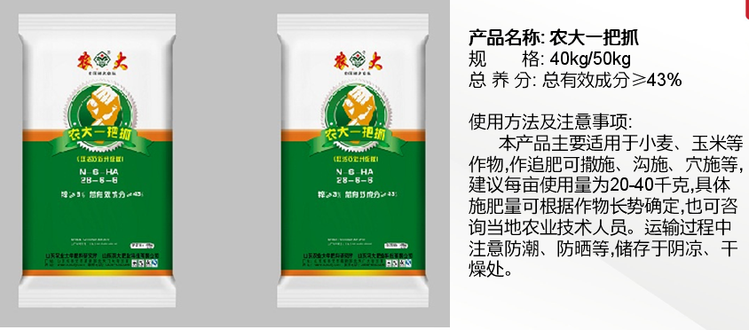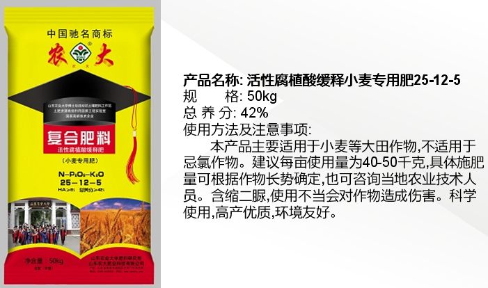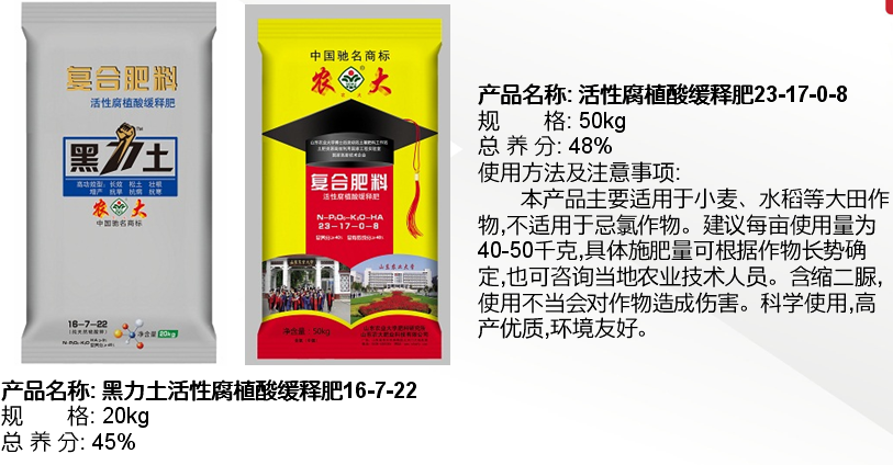 公司“農大”商標是中國馳名商標,產品被認定為“國家免檢產品”,公司產品系列全,種類多,擁有控釋肥、配方復合肥、腐植酸緩釋復合肥、復混肥、有機無機復混肥、沖施肥、葉面肥、微量元素肥料等8大系列80多個品種,另外還研制和開發了用于復合肥生產的多種精細化工產品-防結塊劑等。目前公司市場遍布全國20幾個省市,并遠銷日本,東南亞地區,反映效果良好。